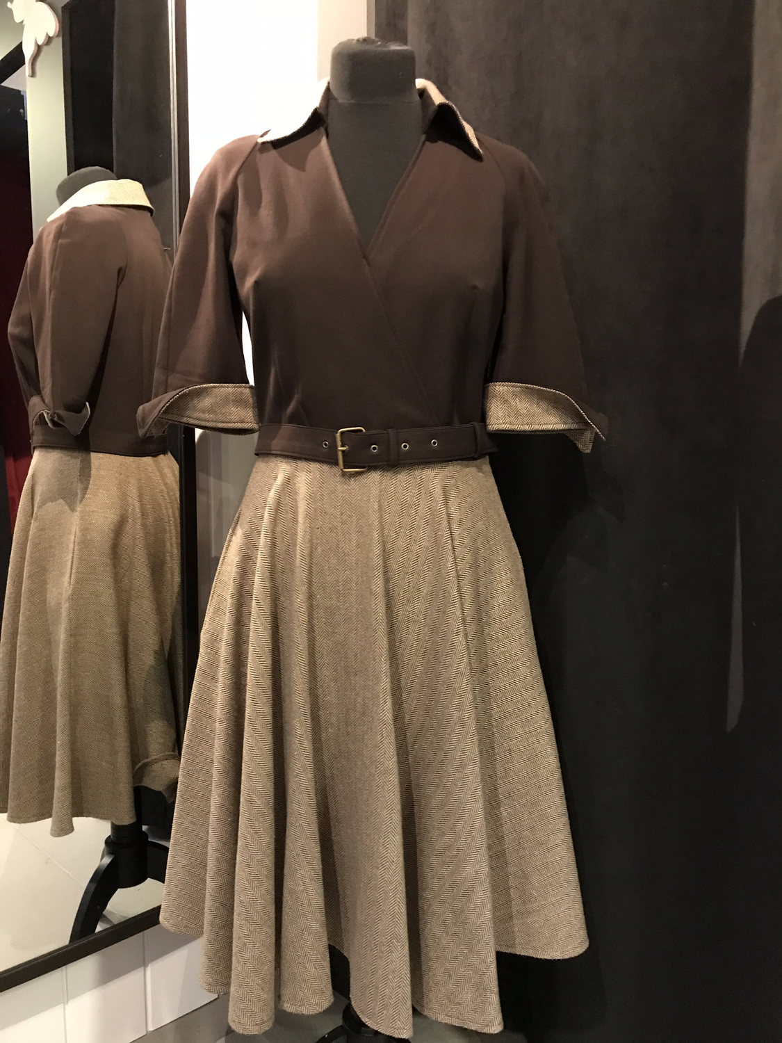 De rok, het kraagje en de manchetten zijn in bruine tweed stof.